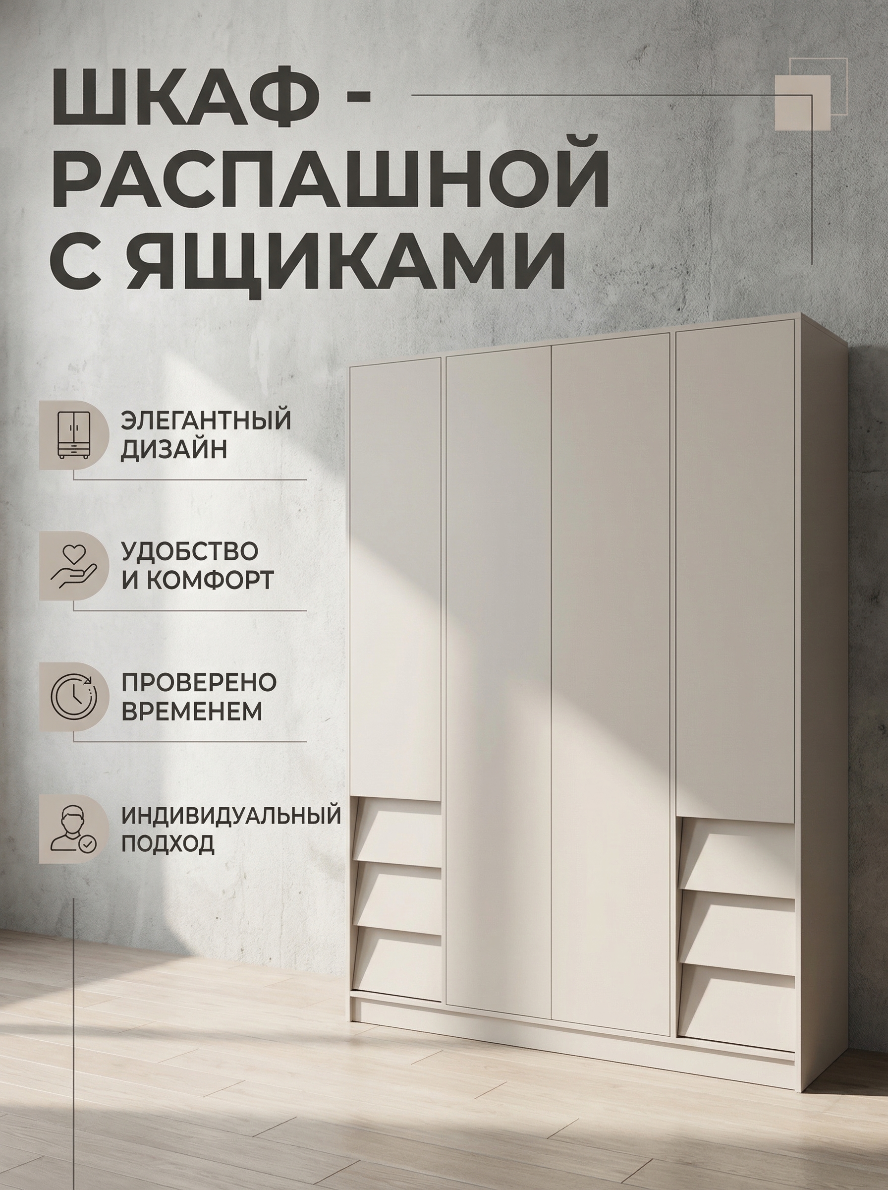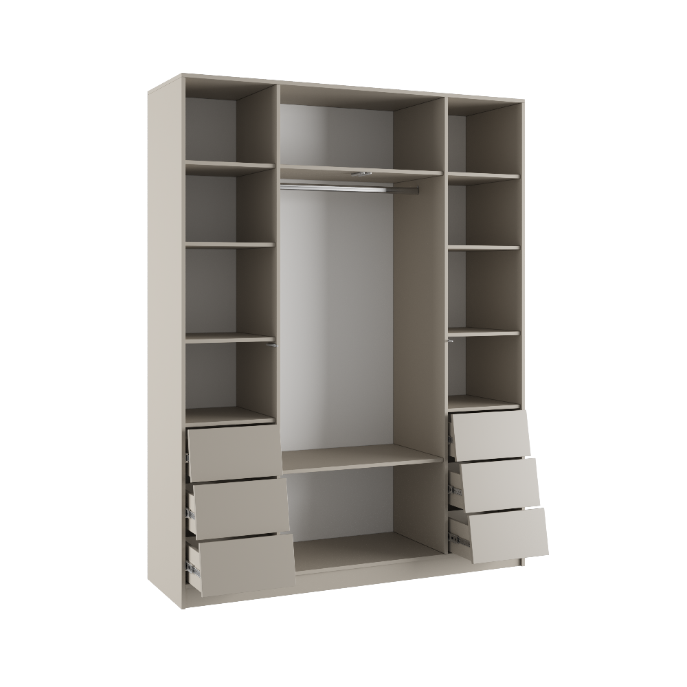 Спальня «Ева» — стильное и функциональное решение для современного интерьера. Гарнитур выполнен полностью в цвете кашемир из качественного ЛДСП, что обеспечивает долговечность и устойчивость к ежедневной эксплуатации. В комплект входят вместительный шкаф 3-х створчатый (160×210×50 см), две прикроватные тумбы (42×44×37 см) и кровать со спальным местом 160×200 см с мягким изголовьем, создавая полный набор для обустройства спальни. Лаконичный дизайн легко впишется в любой интерьер, визуально расширяя пространство и создавая атмосферу уюта и комфорта. Продуманная комплектация позволяет удобно хранить одежду, постельное бельё и личные вещи, а мягкое изголовье кровати обеспечивает полноценный отдых. Спальный гарнитур «Ева» — это сочетание современного стиля, функциональности и комфорта для вашего дома.
