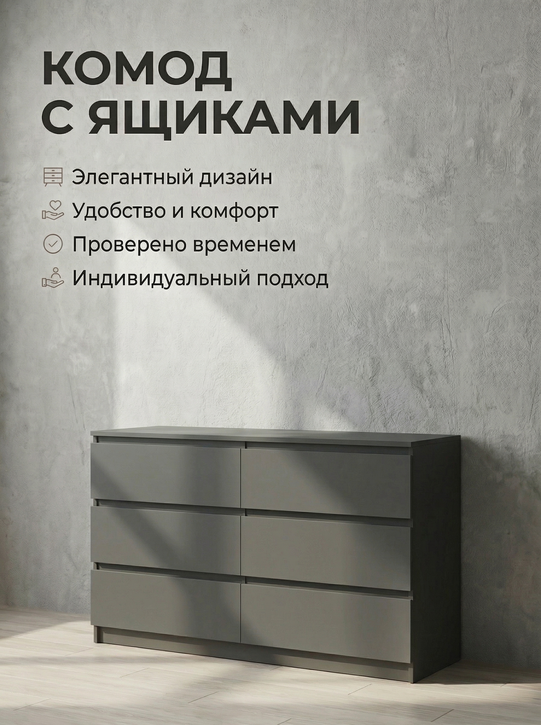 Комод «К6М Мадера» — стильное и функциональное решение для вашего интерьера. Модель оснащена шестью вместительными ящиками, которые позволяют удобно организовать хранение одежды, белья, аксессуаров и личных вещей, поддерживая порядок каждый день. Элегантная деревянная конструкция гармонично впишется в спальню, гостиную или прихожую, добавляя интерьеру уют и теплоту. Удобные ручки обеспечивают лёгкий доступ к содержимому, а качественная отделка гарантирует долговечность и долговременное использование. Оптимальные размеры (ширина 120 см, высота 77,5 см, глубина 42 см) делают комод практичным и удобным для различных помещений. Комод «Мадера» от фабрики Альбина — это сочетание стиля, функциональности и комфорта для вашего дома.