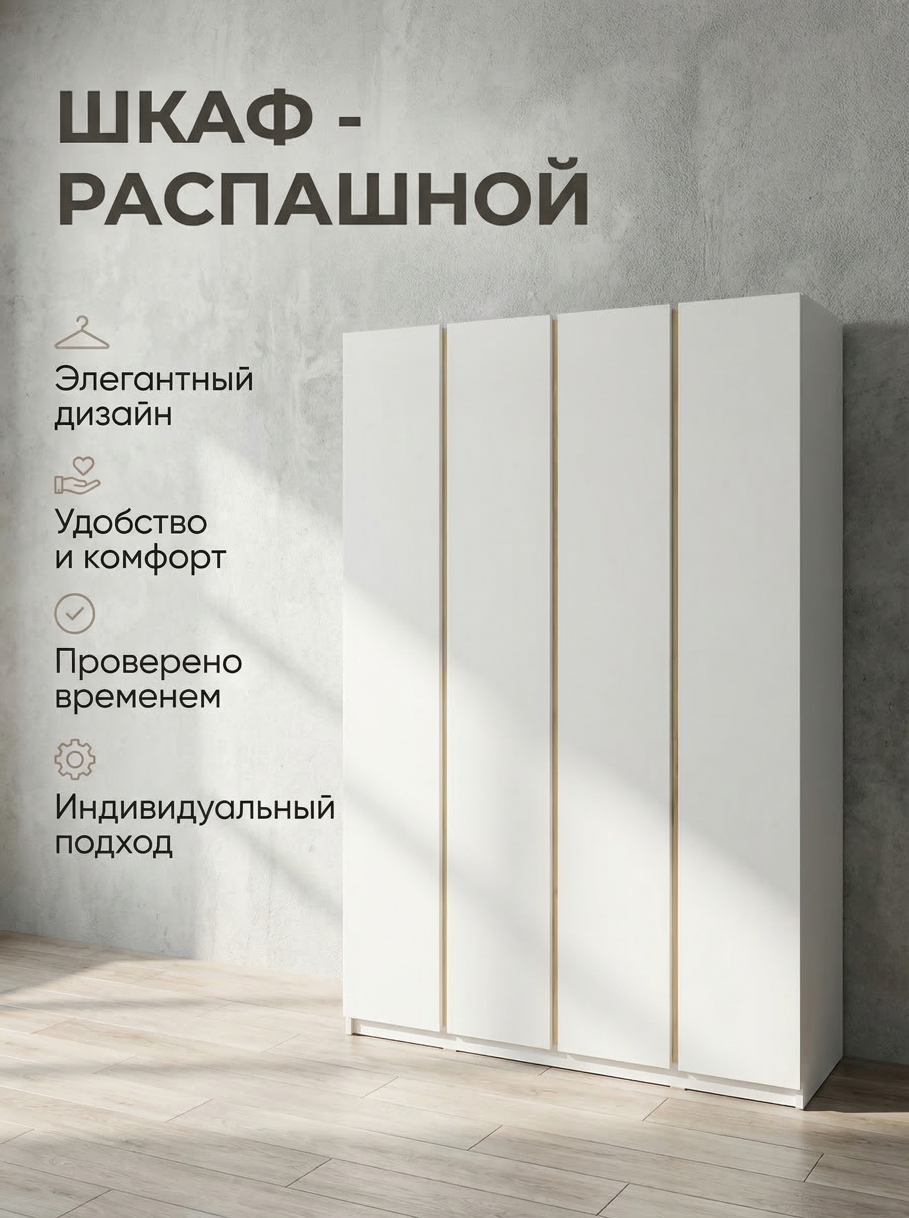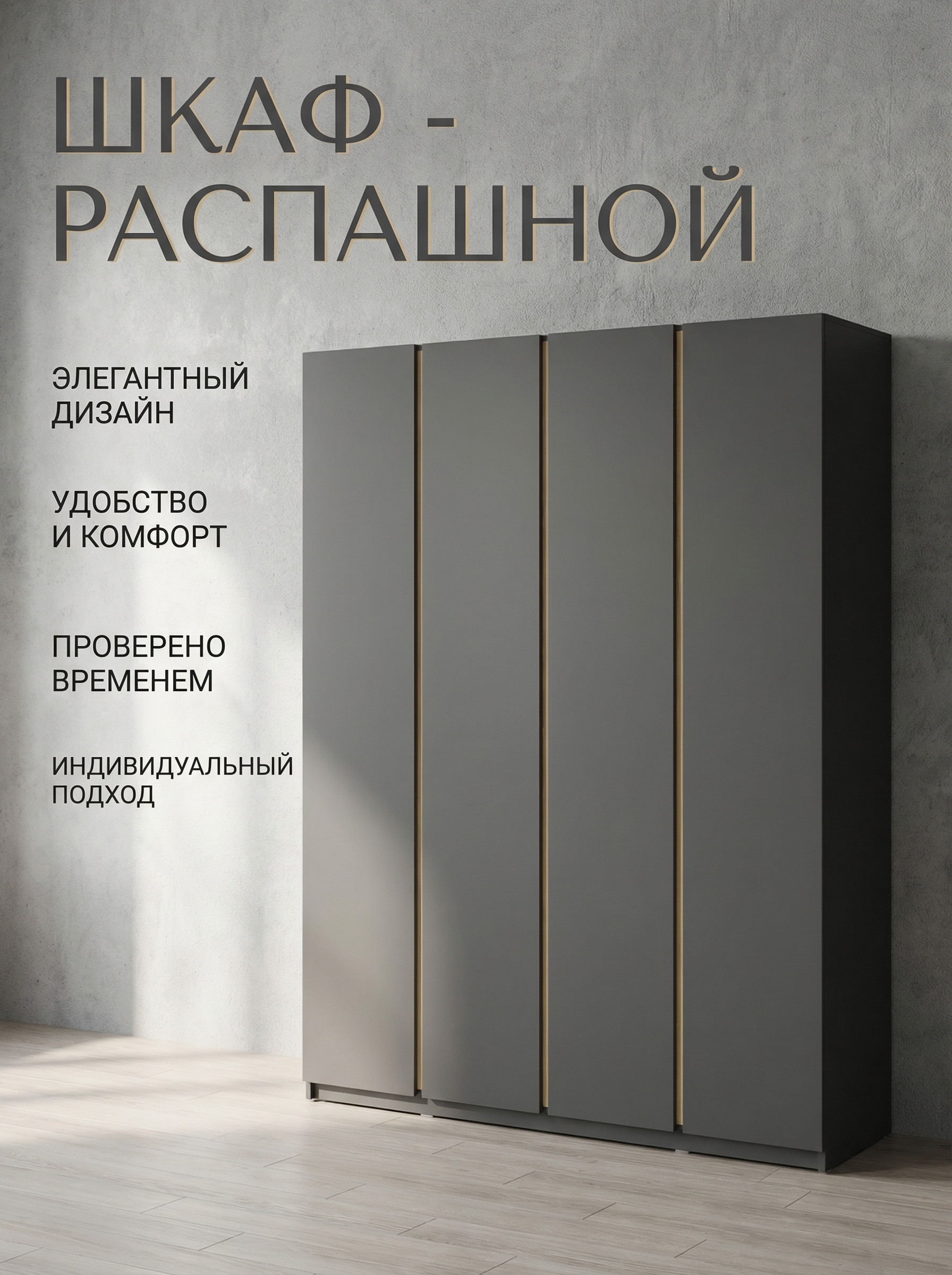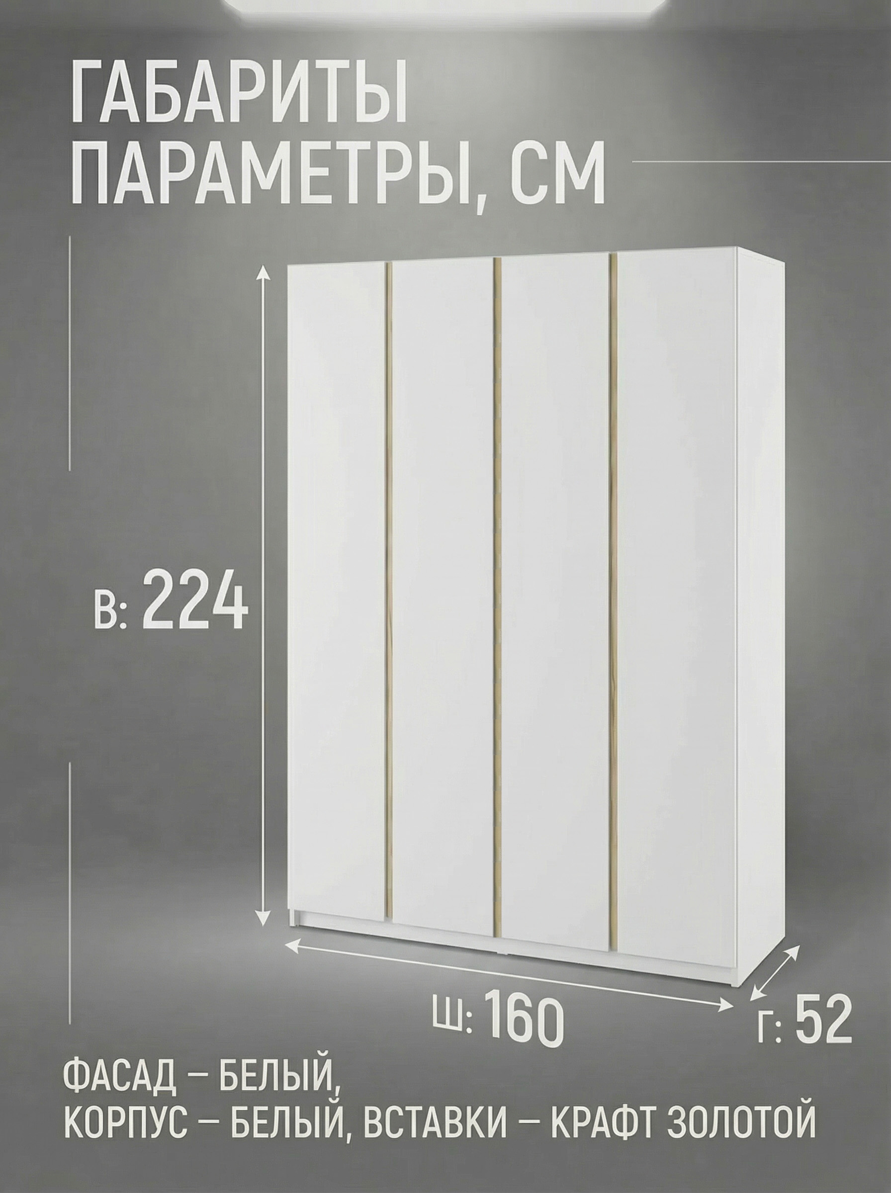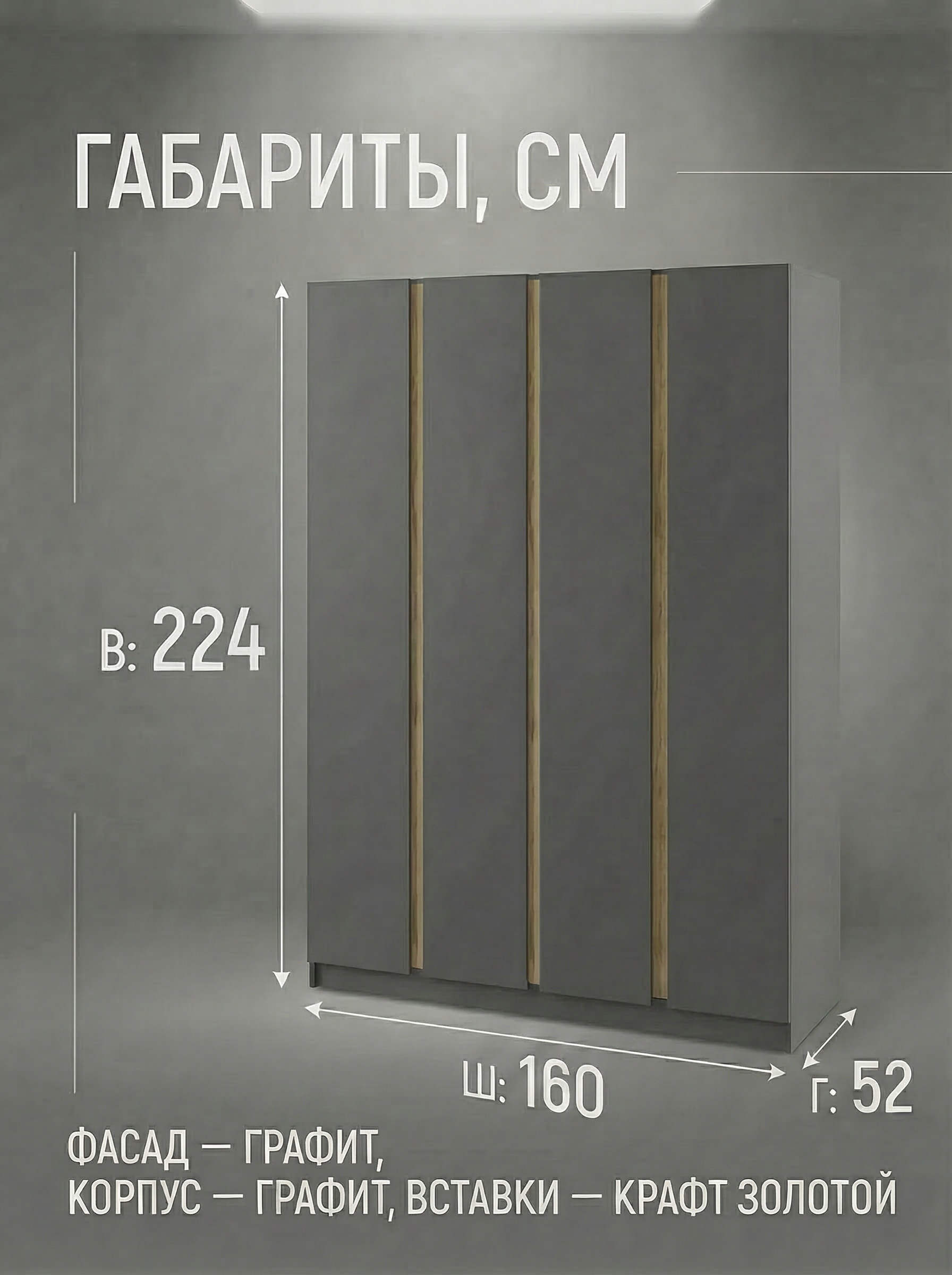 Шкаф «Фаворит» 4-х дверный — современное и функциональное решение для вашего интерьера. Модель сочетает в себе вместительность и стильный минималистичный дизайн без ручек, дополненный контрастной вертикальной планкой, что делает внешний вид актуальным и элегантным. Внутреннее наполнение включает полки и штангу, позволяя удобно организовать хранение одежды и аксессуаров и поддерживать порядок каждый день. Шкаф гармонично впишется в спальню, гостиную или прихожую, подчеркивая современный стиль интерьера. Оптимальные размеры (ширина 160 см, высота 224 см, глубина 52 см) обеспечивают практичность и комфорт в использовании. Корпус и фасады выполнены из безопасного ЛДСП класса эмиссии Е1 и представлены в универсальных цветах: графит, белый и кашемир. В комплекте предусмотрены два варианта вертикальных вставок на выбор: черный или дуб крафт золотой, что позволяет адаптировать внешний вид под ваш интерьер. Шкаф «Фаворит» — это сочетание современного дизайна, качества и удобства для вашего дома.