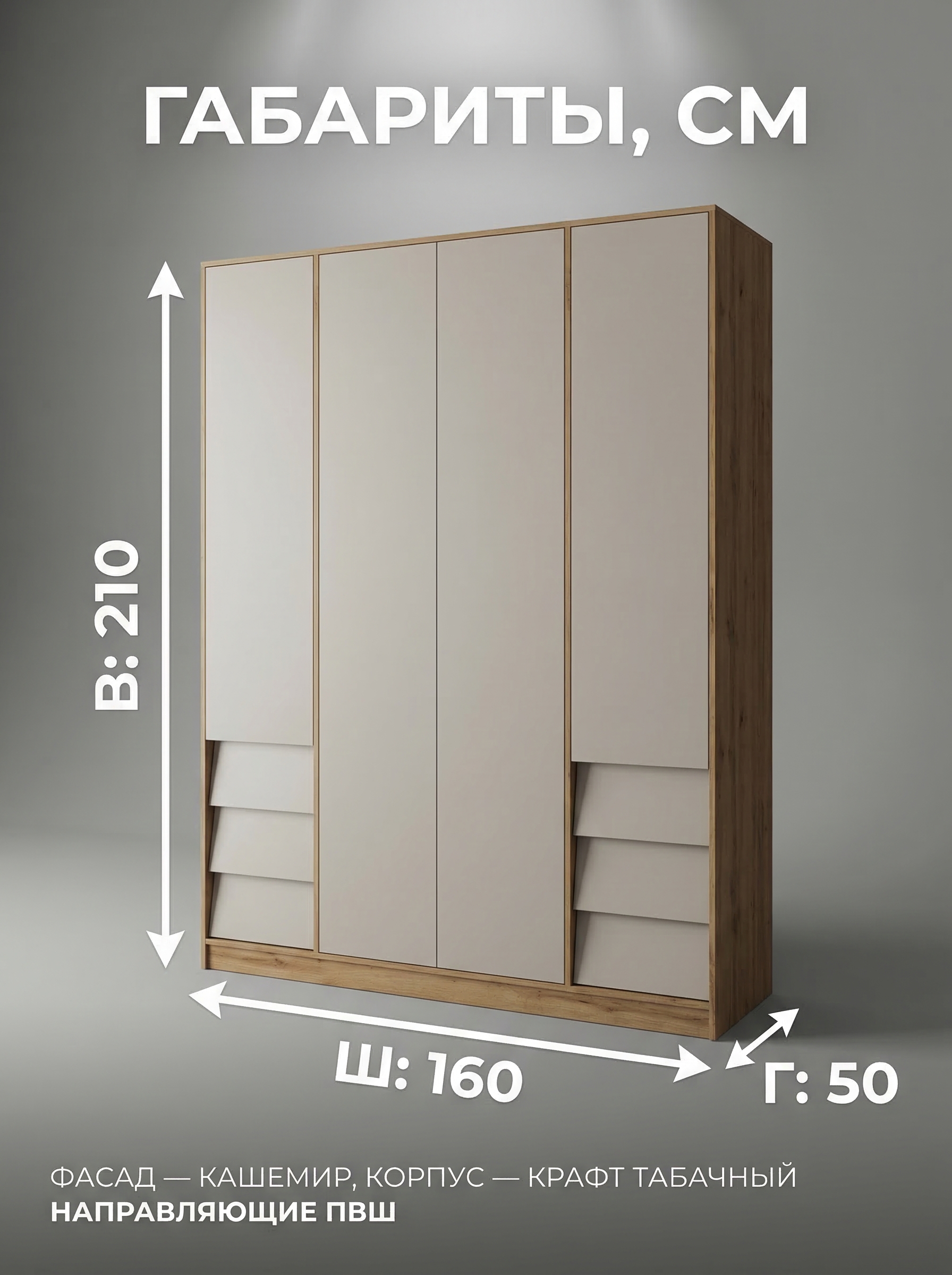 Шкаф «Ева» 4-х створчатый — стильное и функциональное решение для вашего интерьера. Вместительная модель с четырьмя дверцами позволяет удобно организовать хранение одежды, обуви и аксессуаров. Продуманное внутреннее наполнение с полками помогает поддерживать порядок и экономить время на поиске нужных вещей. Лаконичный дизайн без ручек придает шкафу современный и аккуратный внешний вид, благодаря чему он легко впишется как в просторную гостиную, так и в компактную спальню. Оптимальные размеры (ширина 160 см, высота 210 см, глубина 50 см) делают модель практичной для ежедневного использования. Качественные материалы и надежная конструкция обеспечивают долговечность и комфорт. Шкаф «Ева» — идеальное сочетание вместительности, стиля и удобства для вашего дома.
