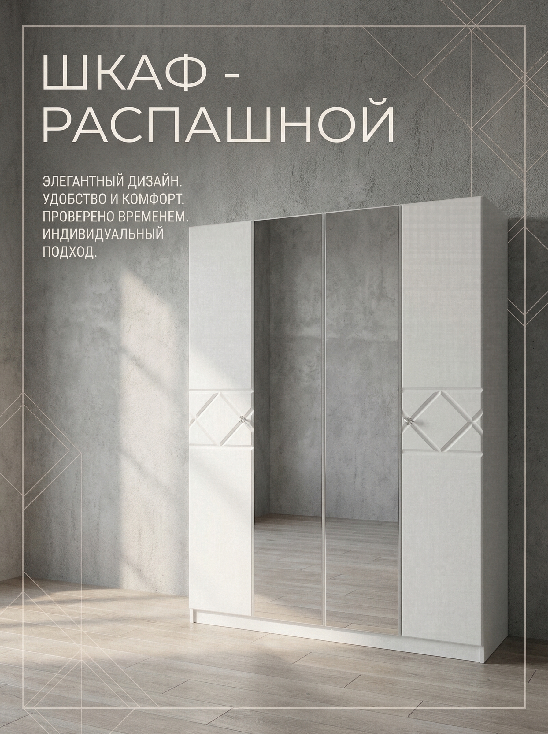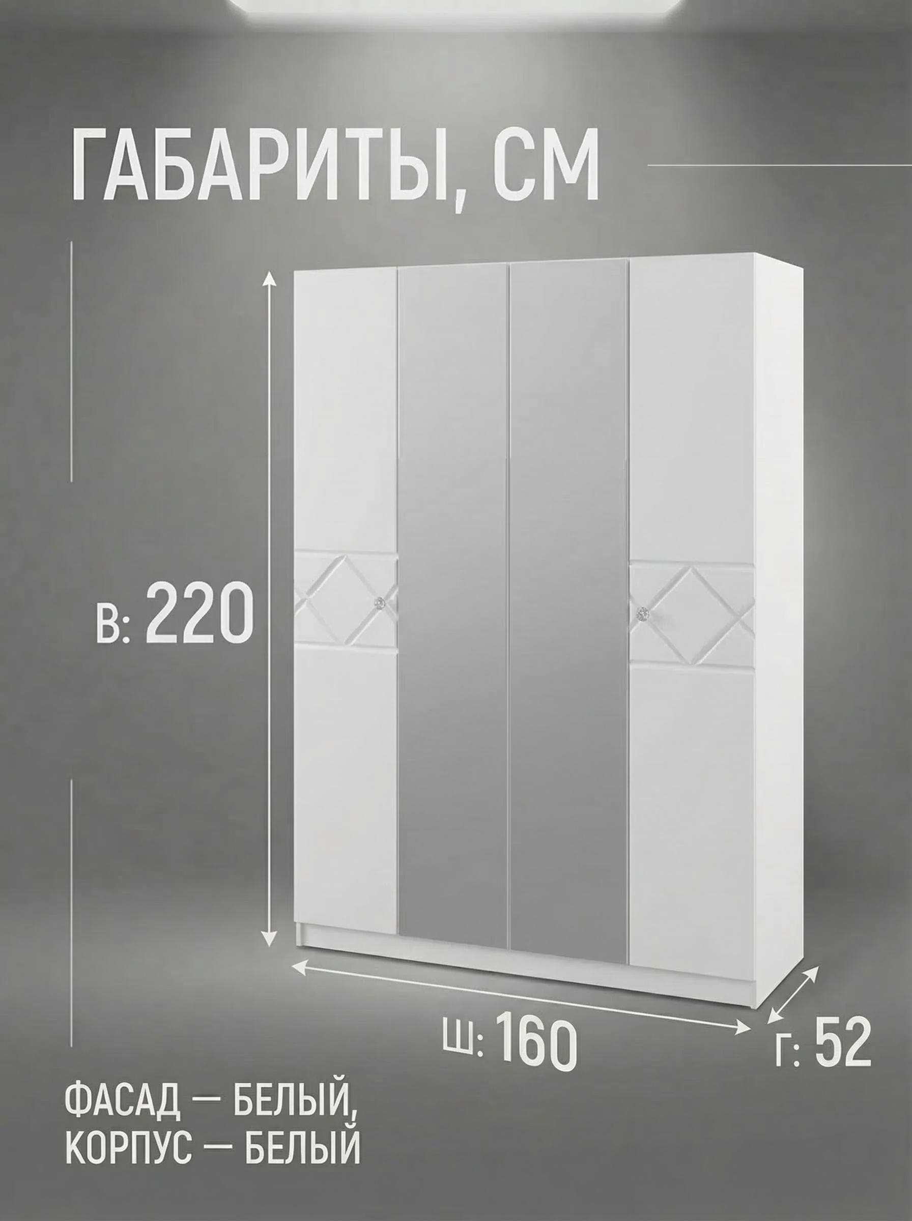 Шкаф «Севиль» 4-х дверный с зеркалами — стильное и функциональное решение для вашего интерьера. Зеркальные фасады визуально расширяют пространство и делают комнату светлее, добавляя интерьеру современный и аккуратный вид. Продуманное внутреннее наполнение включает полки и штангу, что позволяет удобно организовать хранение одежды, аксессуаров и других вещей, поддерживая порядок каждый день. Элегантный дизайн с фасадами из МДФ гармонично впишется в спальню, гостиную или прихожую, создавая атмосферу уюта и комфорта. Оптимальные размеры (ширина 160 см, высота 220 см, глубина 52 см) делают шкаф вместительным и практичным в использовании. Качественные материалы и надежная конструкция обеспечивают долговечность. Шкаф «Севиль» — это сочетание стиля, удобства и функциональности для вашего дома.
