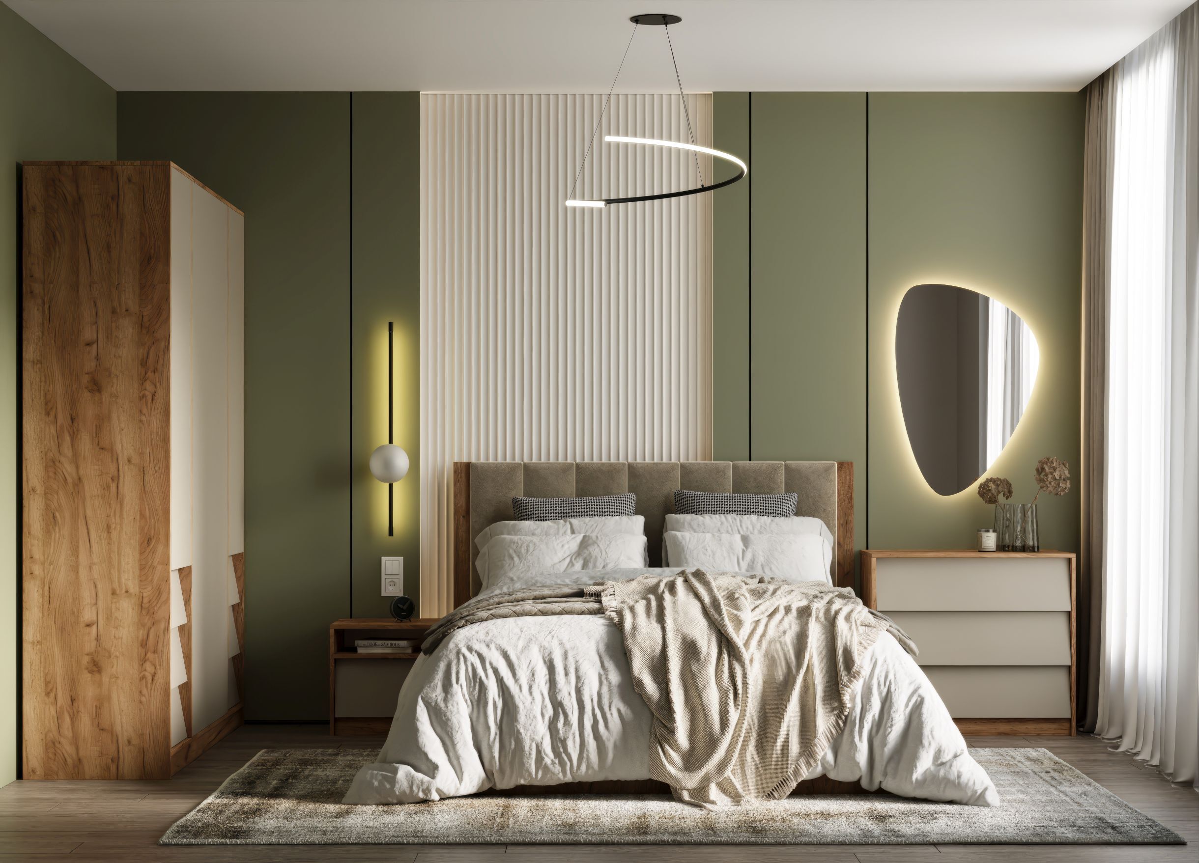 Состав модулей: Шкаф 4-х створчатый, Тумба прикроватная, Кровать, Комод 1