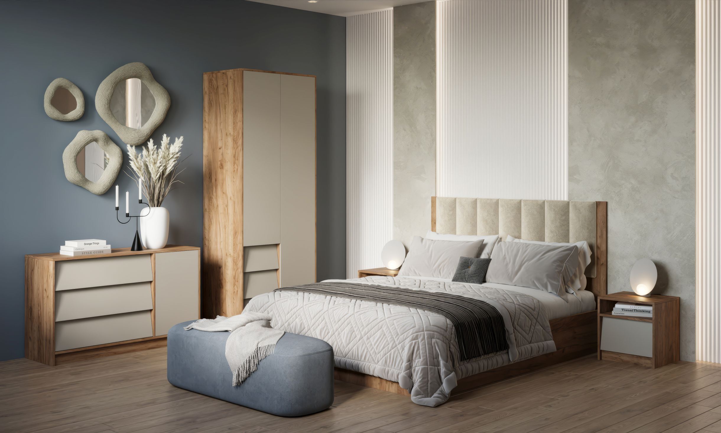 Состав модулей: Комод 2, Шкаф 2-х створчатый, Тумба прикроватная (2 шт.), Кровать